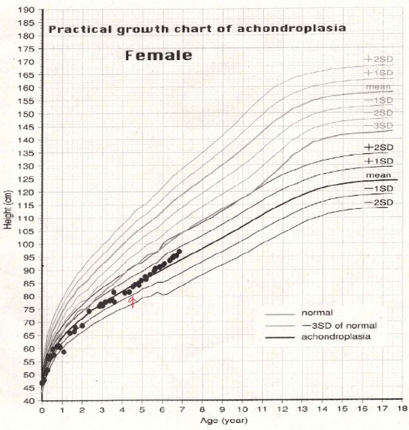 My daughter was prescribed it three years ago. We can see that it is actually helping her bones grow (as shown in the diagram). The X-axis represents age, while the Y-axis shows her height. Until she was 5, her growth followed the average curve, but since then, the slope has become steeper, showing that the medication is working well. It adds about 1.5 cm of height increase per year in addition to natural growth. Regarding the disproportion of her arms and legs, it seems to be helping a bit—at least it is preventing it from worsening. Please be aware that its effects vary from person to person, so please take these results as a reference only.